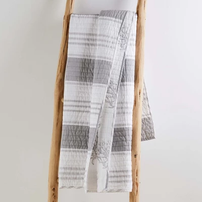 The Nantucket Reversible Quilted Throw by Levtex Home is inspired by a relaxing seaside vacation. This white and grey design will immediately transform your bedroom. Made with the softest lightweight cotton, this reversible throw features a simple stripe design in grey & white, reversing to a coral tossed in grey color on a white ground on the other. The Quilted Throw is perfectly sized at (50x60in.) and is machine washable. Enjoy this for years to come!