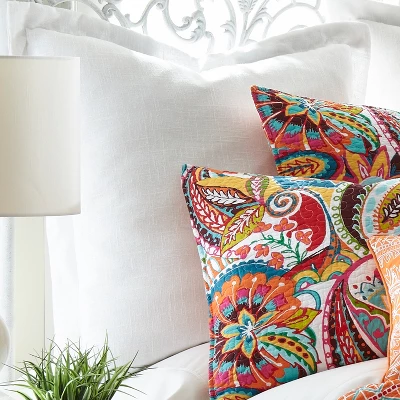 Designed to finish the look of the Rhapsody bedding collection, these euro shams are also useful as an extra layer to lean back on while you read or watch television. Each euro sham is sized at (26x26in.) and features rich durable farmhouse cotton fabric in in plain white, with a thick border to complete the look. They come as a set of 2, pre-filled with a polyester inner. Extremely versatile, they can also be used alone to give any bed a little spot of sophistication, or a bit of holiday cheer.
